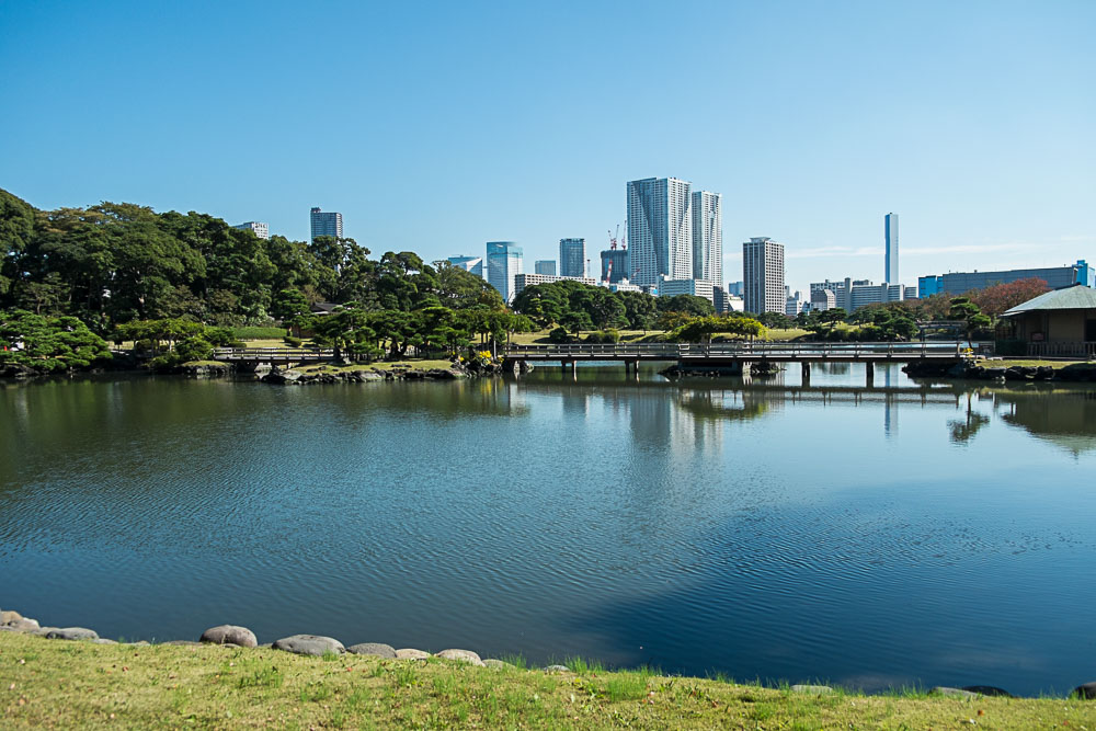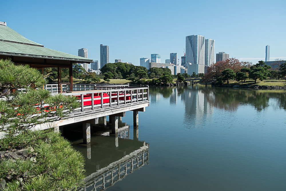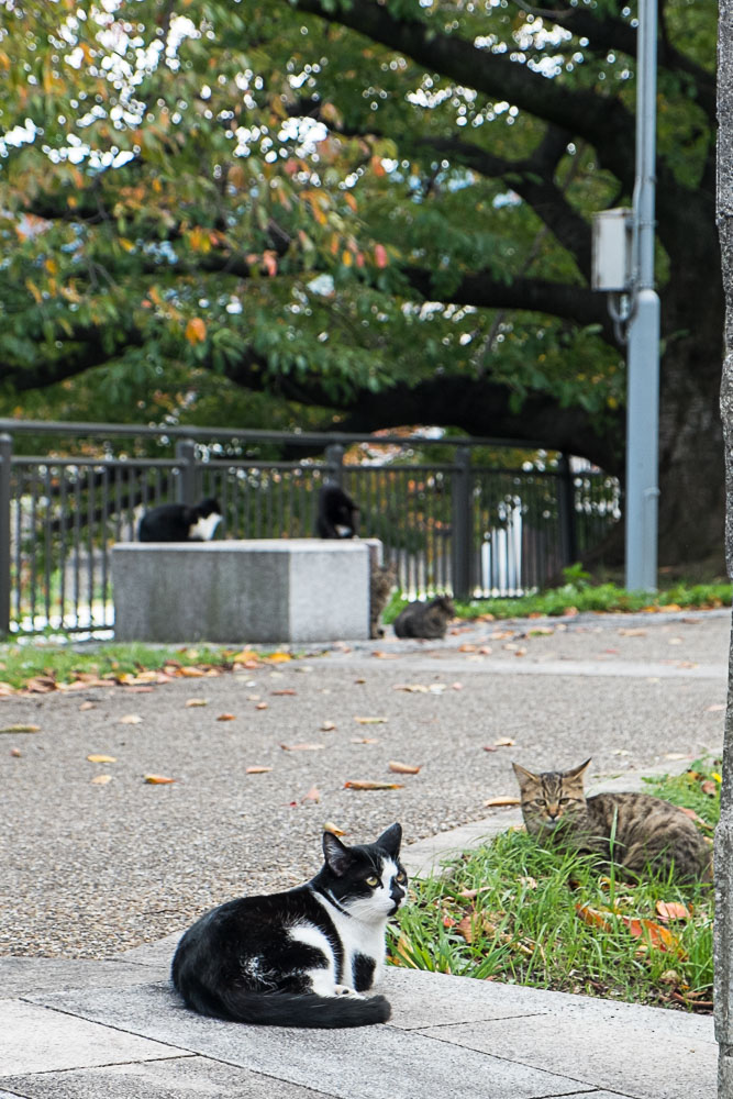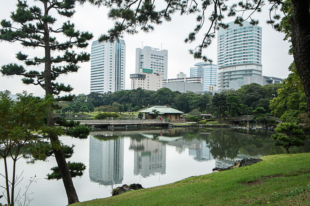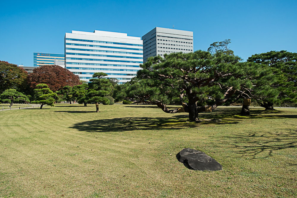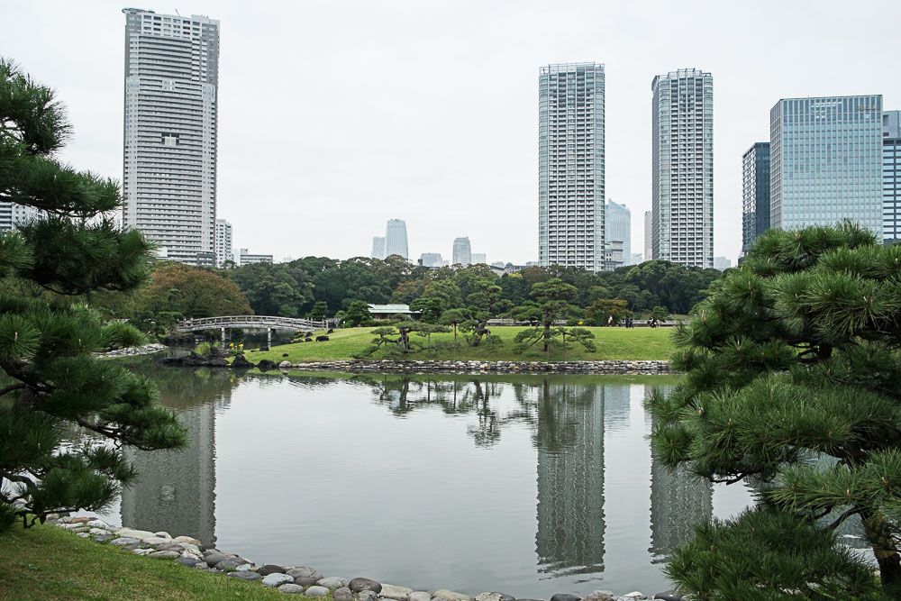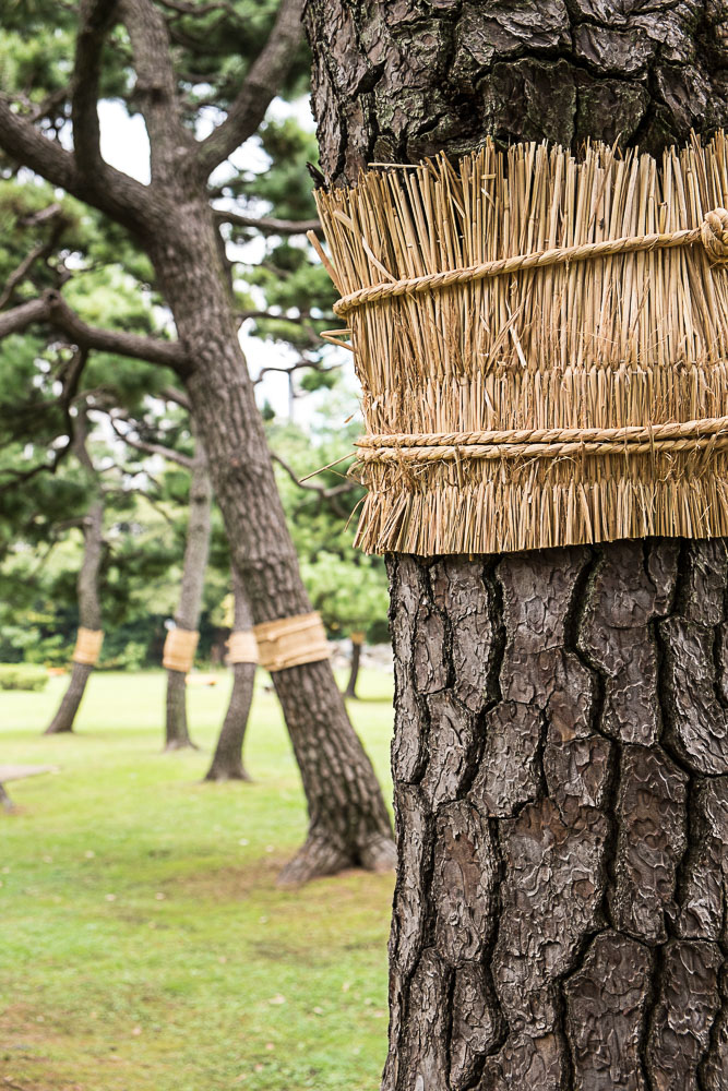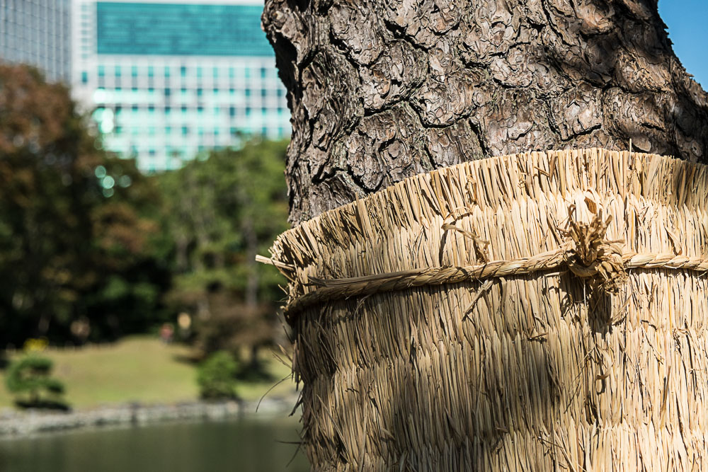 Quitte à être dans le quartier, nous visitons les jardins Hama-Rikyu, une belle découverte (et en plus il y a des chats). Une jolie superficie avec des grands espaces de pelouses plantés de pins noueux et plusieurs étangs avec ponts et pavillons en bois, le tout entouré de gratte-ciels ultra-modernes, un contraste que l'on retrouve finalement assez souvent au Japon. Les pins ont leurs troncs entourés par des tressages de pailles, appelés komo-maki. Ces dispositifs sont une illustration de l'ingéniosité japonaise : contrairement à ce qu'on pourrait croire, ils ne sont pas destinés à tenir chaud. Ni même à empêcher les parasites de monter dans l'arbre, mais au contraire à les empêcher de descendre. Car s'ils descendent avant l'hiver c'est pour s'enterrer et se protéger du froid. Ces andouilles se glissent donc entre la paille et l'écorce (la paille est moins serrée en haut qu'en bas), ils restent coincés et hivernent. Avant le printemps, il suffit de retirer la paille et de la bruler avec les parasites dedans.