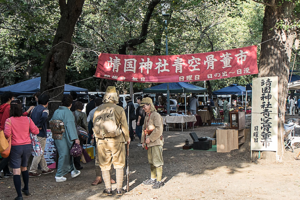 Nous repartons à travers le jardin du palais impérial vers le sanctuaire Yasukuni (célèbre pour les remous qu'il provoque annuellement dans "l'amitié" sino-japonaise). Une brocante avec japonais déguisés en soldats de l'armée impériale, nous y accueille.