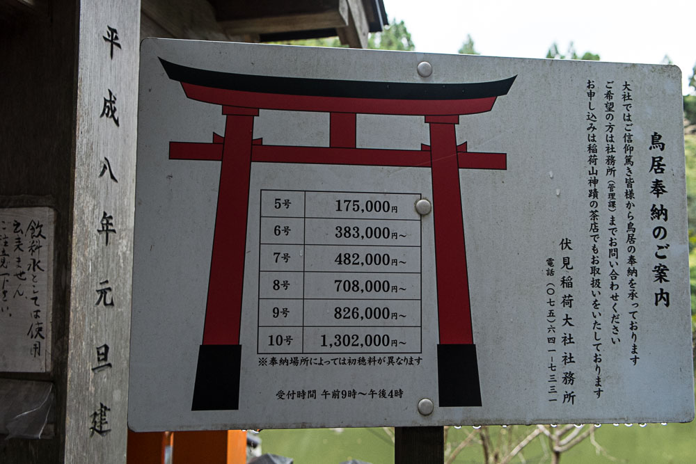Si jamais vous voulez dédier un tori, voici les prix en fonction de la taille :