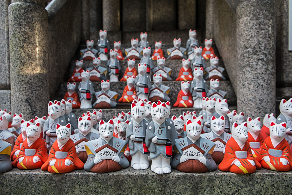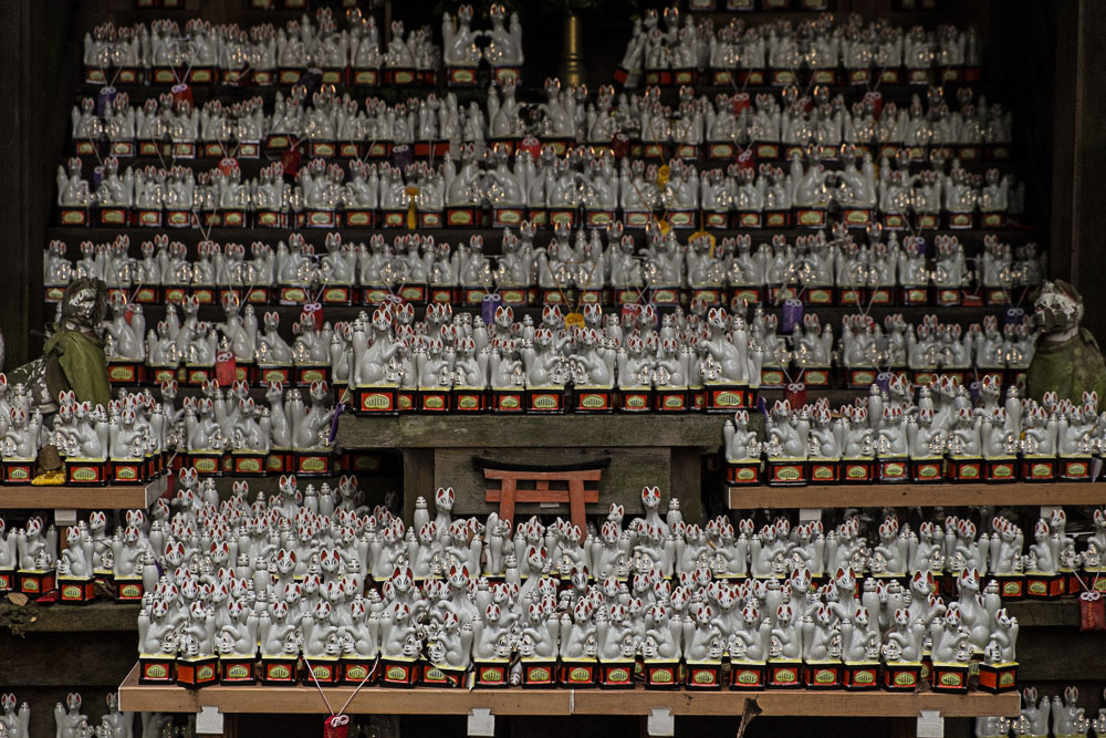 Comme Inari, divinité de beaucoup de choses dont les céréales et les prostituées, aime à s'incarner en renard (Kitsune), vous en verrez aussi pléthores, de part et d'autres des autels.