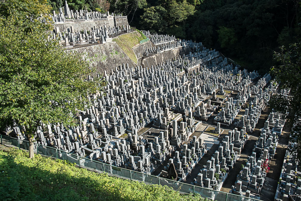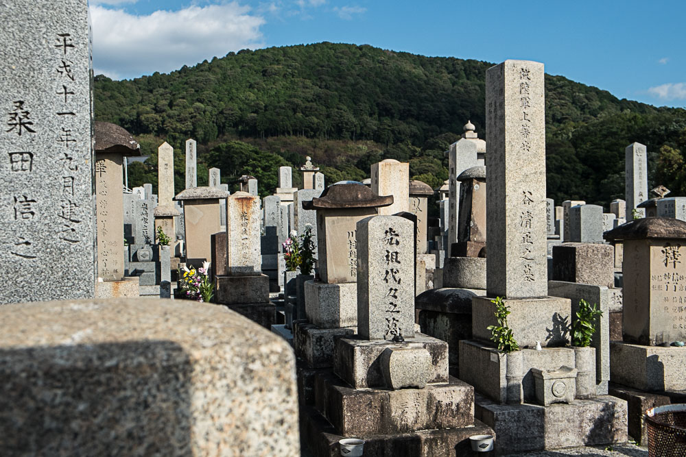 Nous prenons ensuite la direction de Kyomizu Dera, en passant par un vaste cimetière à flanc de collines. Les cimetières sont à l'image des villes, denses, très denses ! Celui n'est en plus pas très boisé ce qui accentue l'effet de masse.