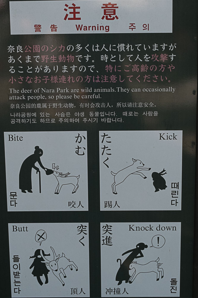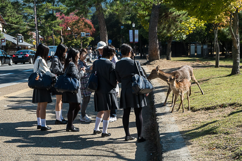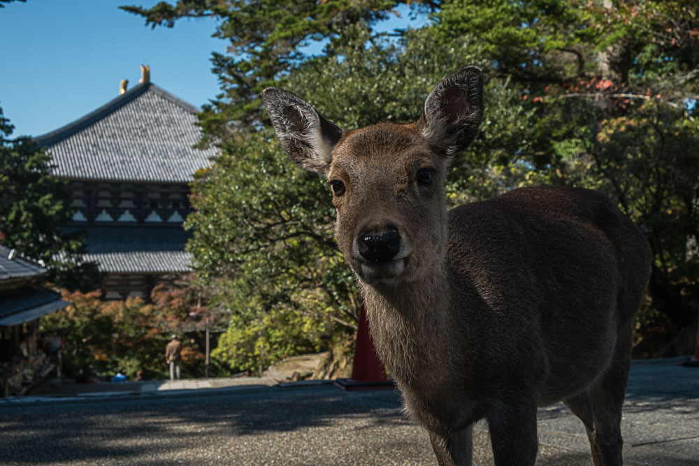Au sortir de la gare, je me rends compte que ma mémoire me joue encore des tours : je n'avais pas souvenir que Nara était aussi "ville" que ça, il me semblait qu'il y avait un peu plus de verdures avant d'atteindre les temples. Ceci dit il y a toujours plein de daims ! Et ils sont toujours aussi attachants. Collants plutôt, mais ils sont tellement mignons ! Ils rodent en meute, assoiffés de biscuits que des marchands ambulants et obligeants vendent aux touristes. Les bestioles ont bien flairé le filon et restent à proximité des camelots, l'oreille aux aguets du moindre bruit trahissant l'ouverture du plastique de la bouffe !
