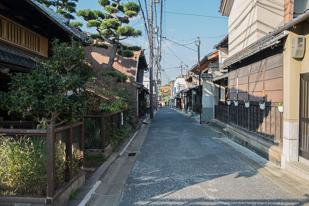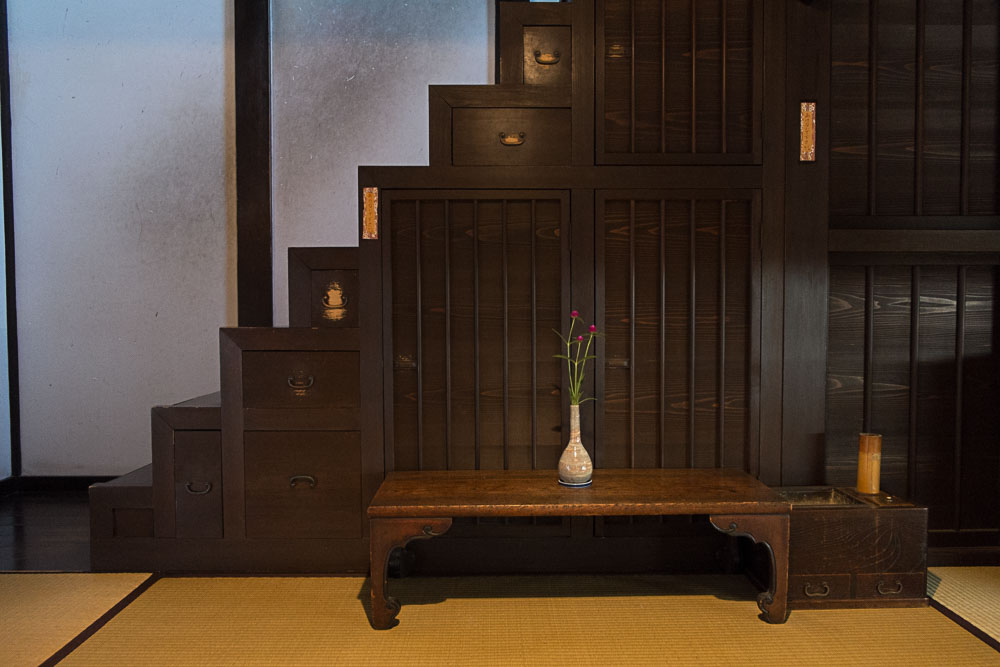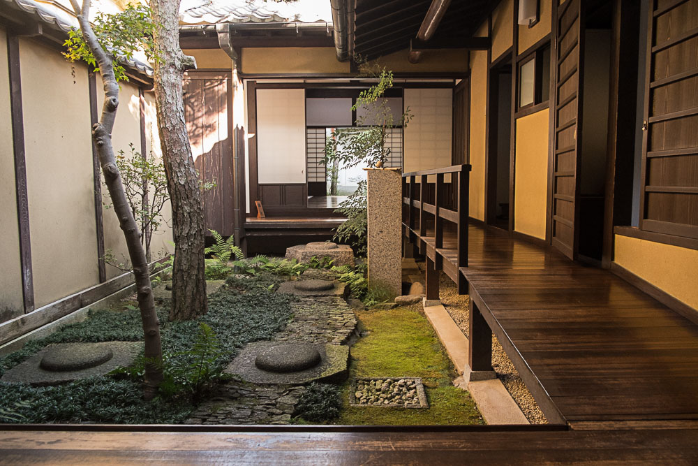 Parmi ces maisons, une machiya toute en longueur (pour économiser sur la taxe foncière calculée selon la largeur du bâtiment), avec un jardin intérieur (Naka Niwa) aussi petit que mignon. La machiya est un bâtiment intégrant des parties commerciales sur la rue, le stock, et les parties privatives.