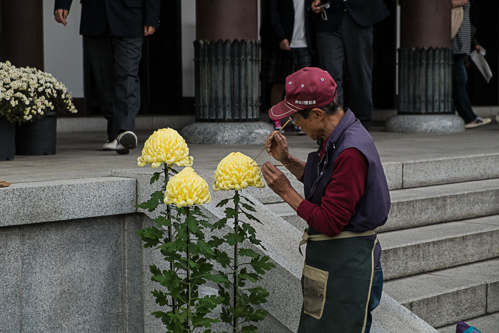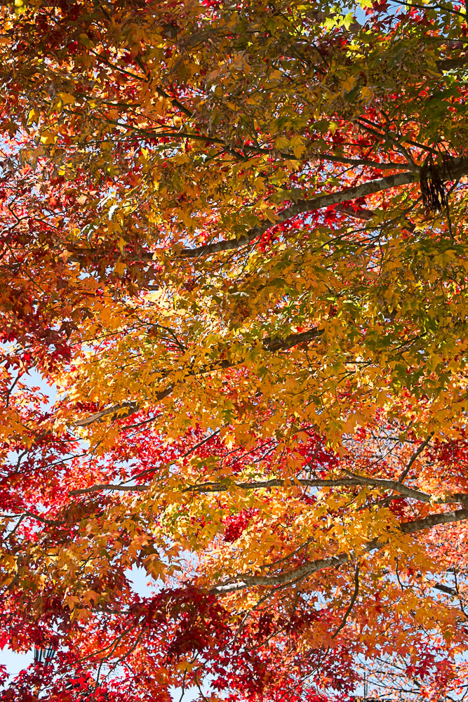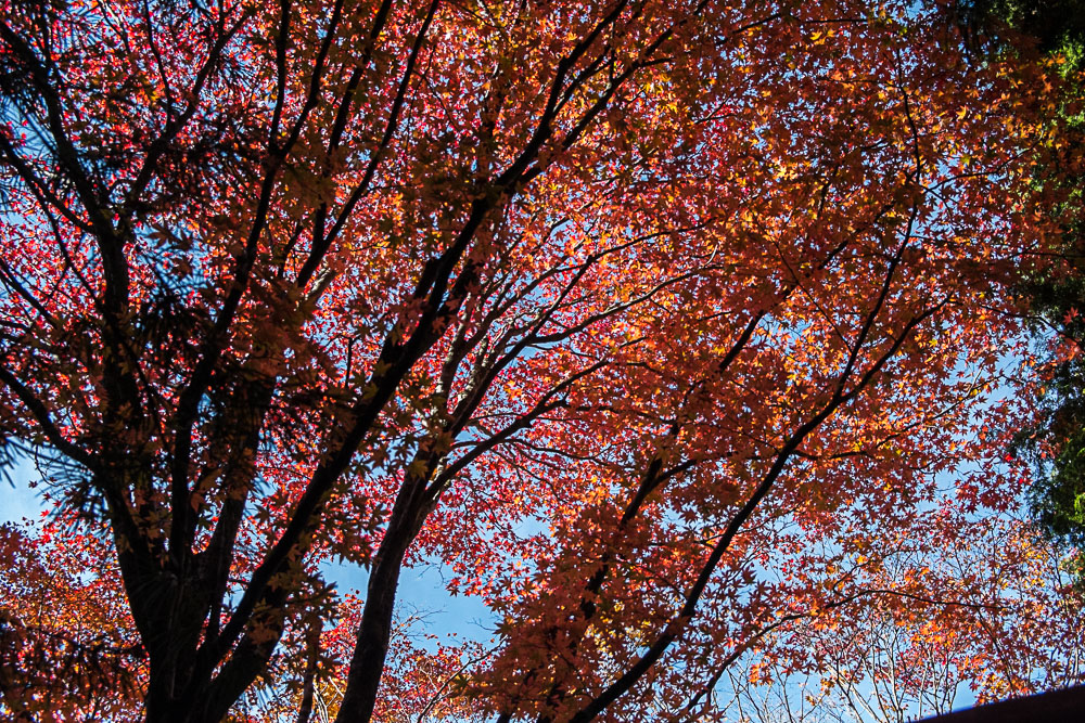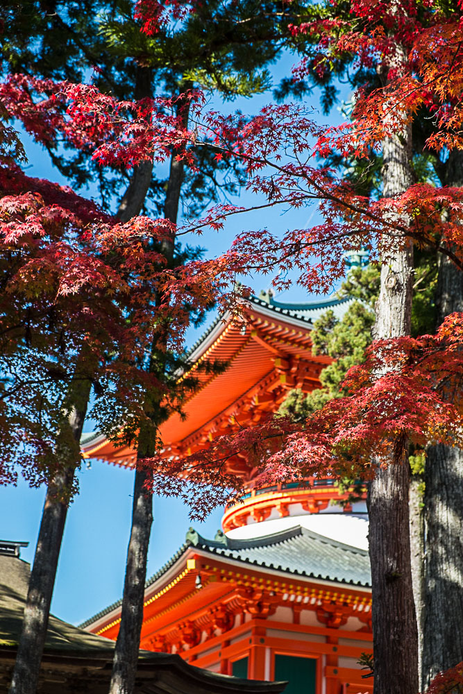 ressortir les feuilles d'érable, déclinant l'ensemble de la gamme chromatique du vert au rouge, l'azur du ciel et les temples. Les érables, c'est la contrepartie "fin de siècle" des cerisiers en fleurs, l'achèvement du cycle avant la trêve hivernale et si cela reste un peu moins médiatique, la passion japonaise pour la beauté impermanente s'y immerge jusqu'à plus soif.