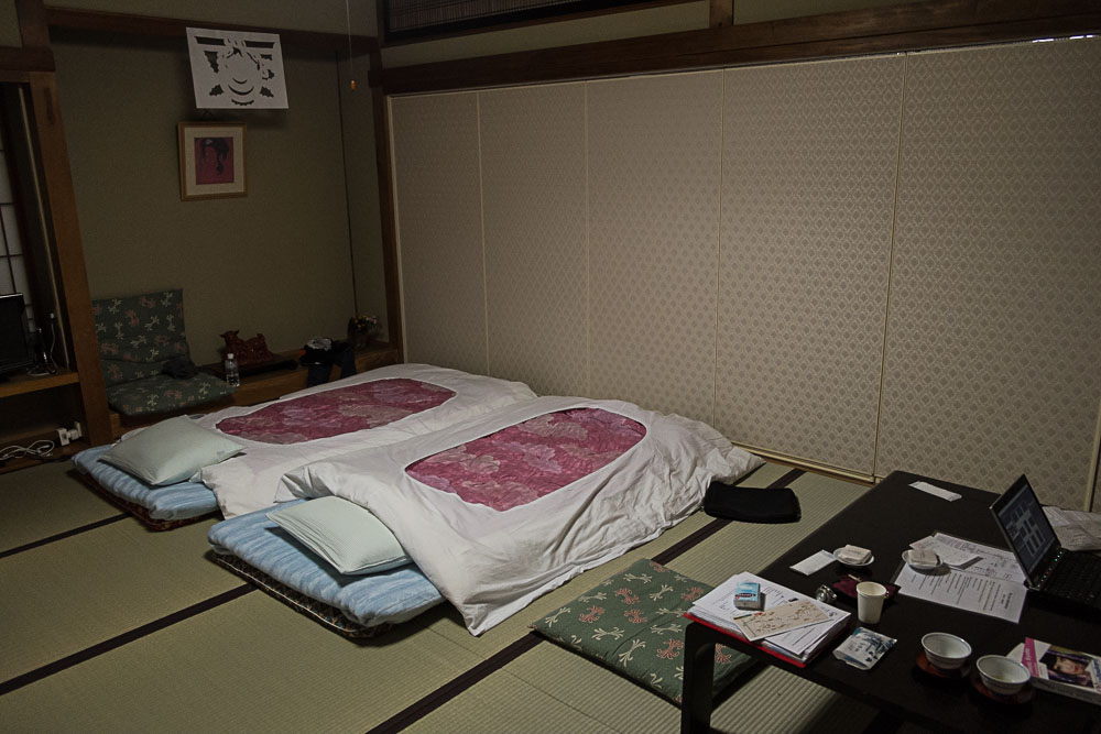 Nous faisons le check-in dans le temple, le moine nous offre le thé, on lui offre 12000 Yen (oui pas que pour le thé) et nous décrit les règles : fermeture de la porte à 9:00, cérémonie à 6h30 du matin. Sans oublier, température intérieure 11°C, et oui le papier c'est assez moyennement isolant.