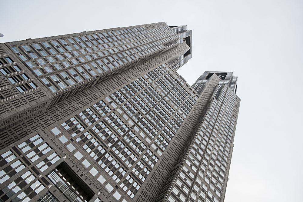 Changement total de décor pour Shinjuku, l'ultra-moderne. Après un déjeuner, nous allons au 45ème étage de la mairie de Tokyo, qui a le bon coup de rester gratuit. La météo n'est pas forcément favorable (il crachine), on croit deviner l'esquisse des pentes du Fuji-san, mais c'est peut-être (sûrement) notre imagination.