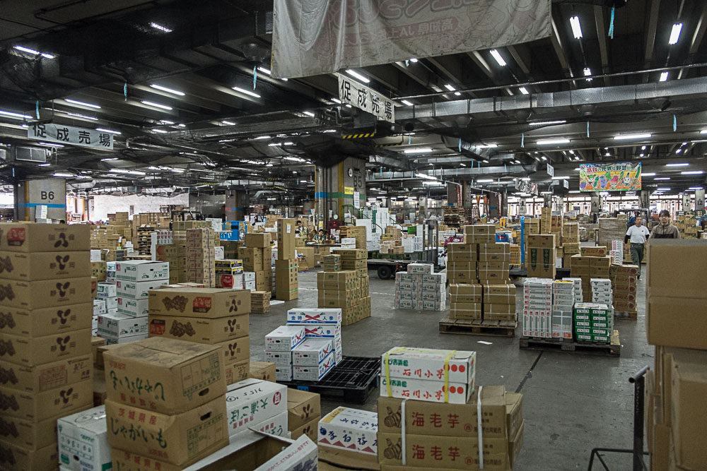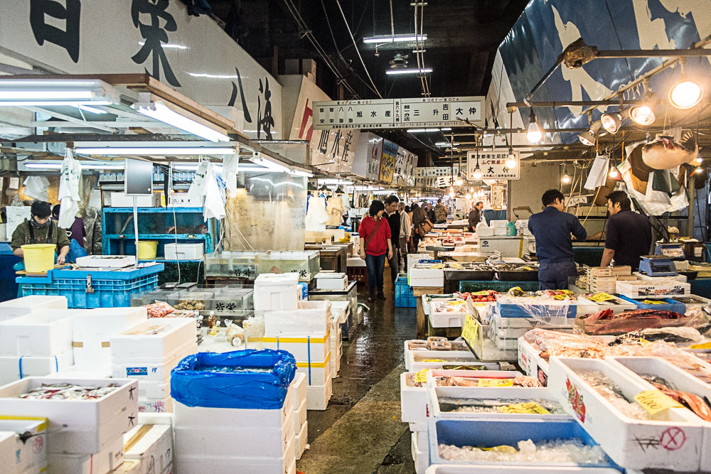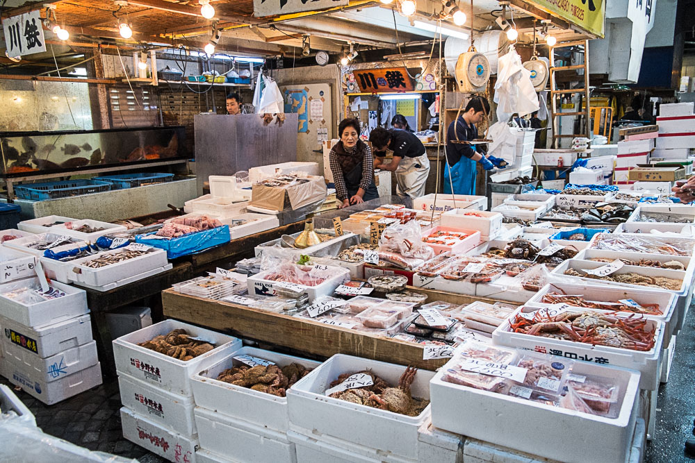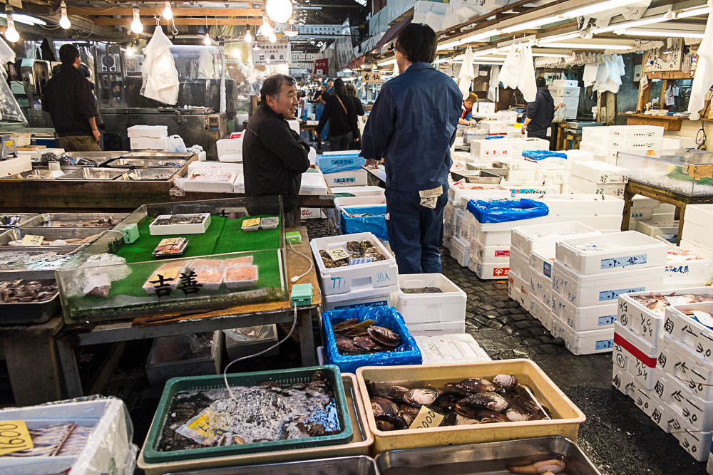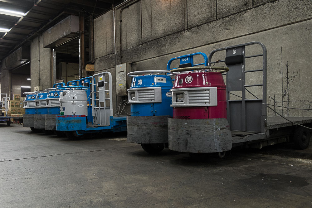Alors, foin de salles blanches et de plans de travail immaculés, vous verrez moins de masques chirurgicaux que dans le métro. Non ici, le milieu est plutôt old-school, rustique, voire un peu bordelique par endroit. Les triporteurs se faufilent à tout berzingue dans des allées, prenant un malin plaisir à arroser le distrait en roulant dans les flaques qui minent ça-et-là le sol. Les cheminements sont plus ou moins praticables (bon en fait ils sont souvent très encombrés), submergés par des bacs remplis de tous les poissons de la terre (plus exactement de la mer). Un seul mot d'ordre : coquillages, crustacés, osteichthyes de tous les pays, unissez-vous, venez vivre une (ultime) expérience hors du commun, avant de vous retrouver en sashimi dans une cuisine de la capitale nippone.