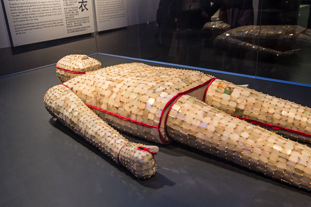 Encore plus prestigieux, symbole d'éternité, le jade est présent dans les tombes sous la forme de linceuls, véritable armure complète, destinée à la protection de l'intégrité physique du mort. Celui qui est présenté comprend 4248 plaquettes cousues au fil d'or réservé aux fils des cieux, les sous-fifres n'ont le droit qu'au fil d'argent ou de cuivre.