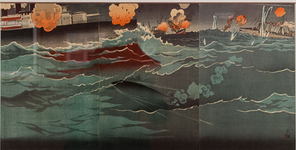 Estampe d'une torpille japonaise à l'assaut d'un cuirassé russe :