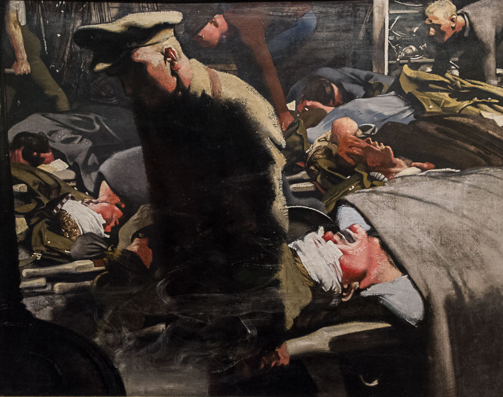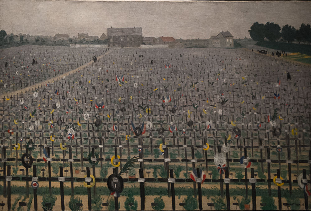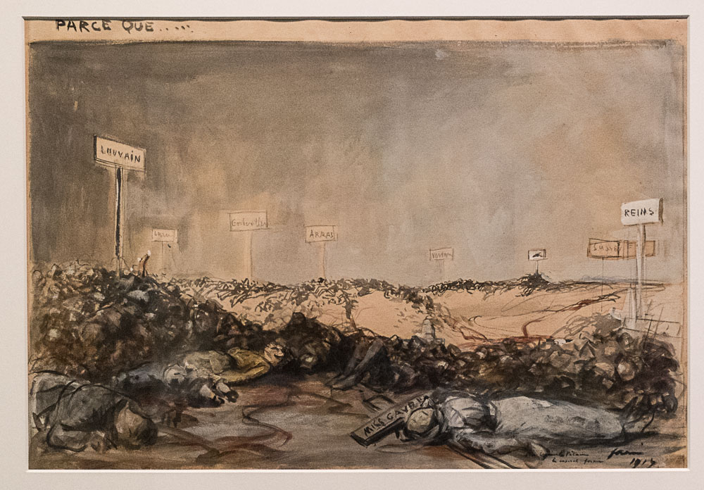 Une longue frise, bienvenue, met en parallèle événements politico-militaires et artistiques. On aborde ensuite la seconde partie de l'exposition, à l'étage, qui présente une grande quantité d’œuvres sur tous les aspects de la vie au front.
