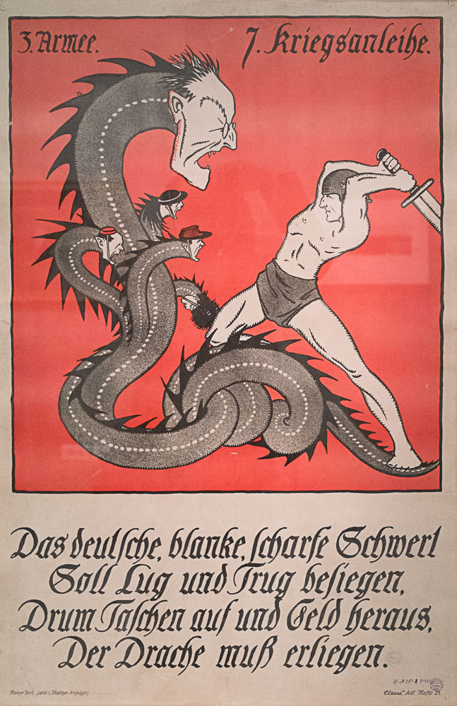 Côté propagande, on cherche des symboles forts, à même de cristalliser l'esprit du public. Ce sera, par exemple, la cathédrale de Reims, qui incarne les pratiques barbares des hordes d'Outre-Rhin déferlant sur la Chrétienté. Ou l'hydre qui sera utilisée des 2 côtés des tranchées.