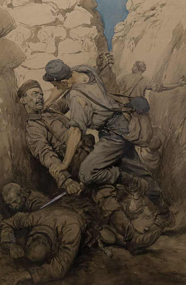 Les premières images sont encore des œuvres d'imagination, idéalisées, faute de matériel concret, mais bien elle deviendra le premier engagement illustré par les premiers concernés : ceux qui sont au front.