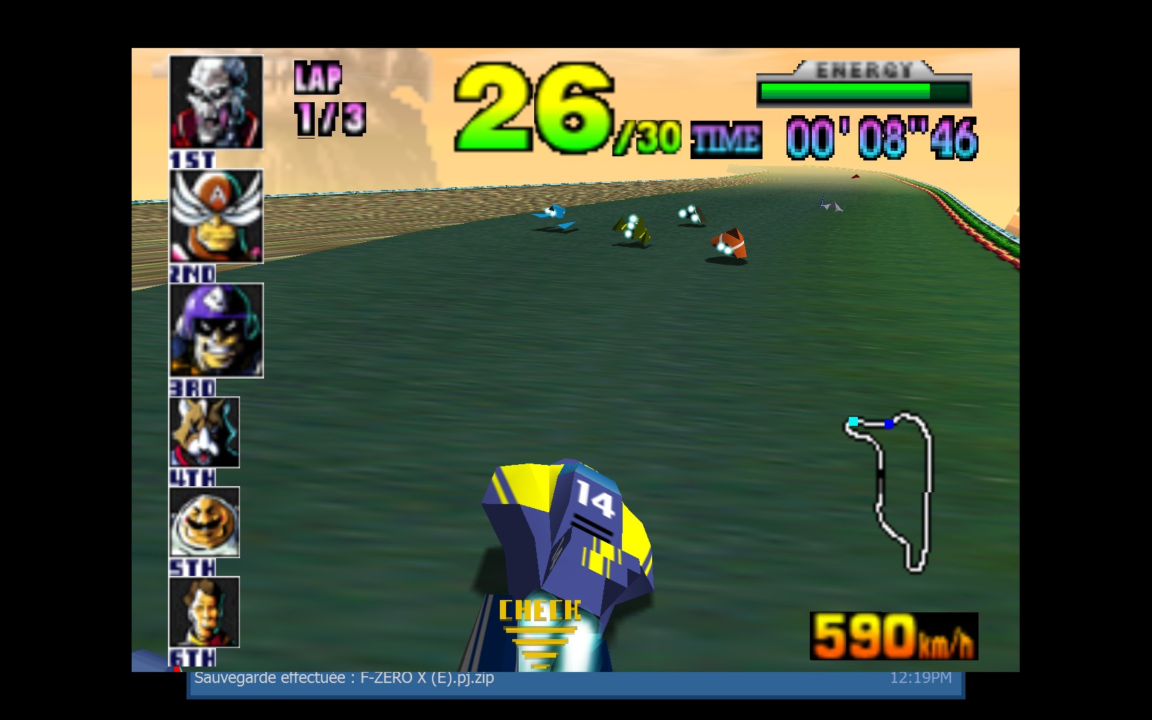 F-Zero X (N64) avec un joli lissage des textures (mais qui fait un contraste encore plus violent avec les sprites 2D qui n'ont pas le droit au même traitement)