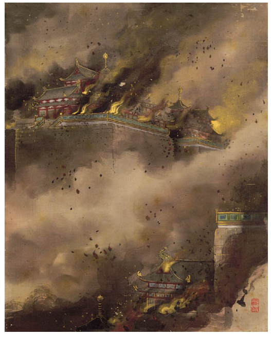 Le visage guerrier apparaît : avions, soldats. Car la nouveauté, c'est l'engagement politique voire violent des artistes de l'école de Lingnan, aux côté de Sun Yat Sen, face au moribond pouvoir impérial.