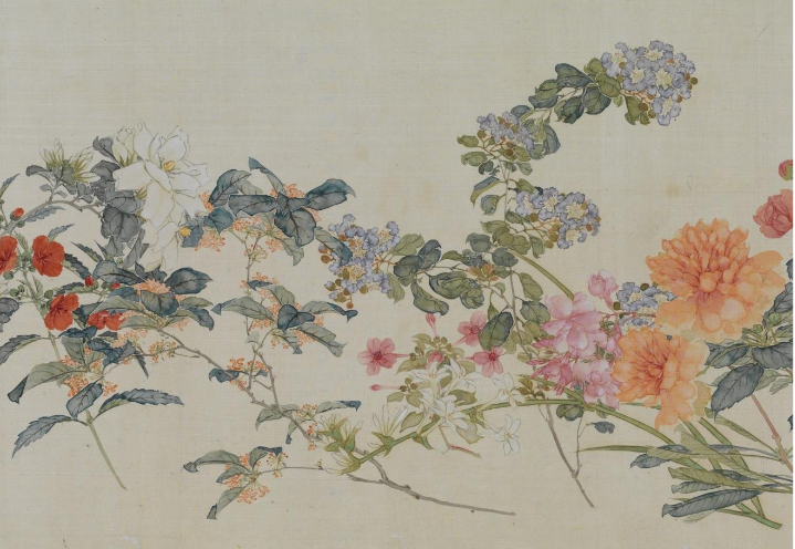 Ju Lian (1828-1904) Rouleau aux 100 fleurs (encre et couleurs sur soie), plus de 6 m de long