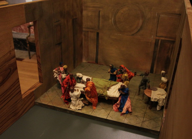 On débute donc par des mannequins... non même pas, mais par la "grande machine" de Nicolas Poussin. Grosse caisse en bois, contenant une maquette de la scène à peindre avec des orifices permettant de simuler le rendu de l'éclairage et un œilleton pour observer le tout. Comment ça, on comprend rien à mes explications ? Voilà le dispositif mais sans le couvercle, la porte à droite permettant l'éclairage :