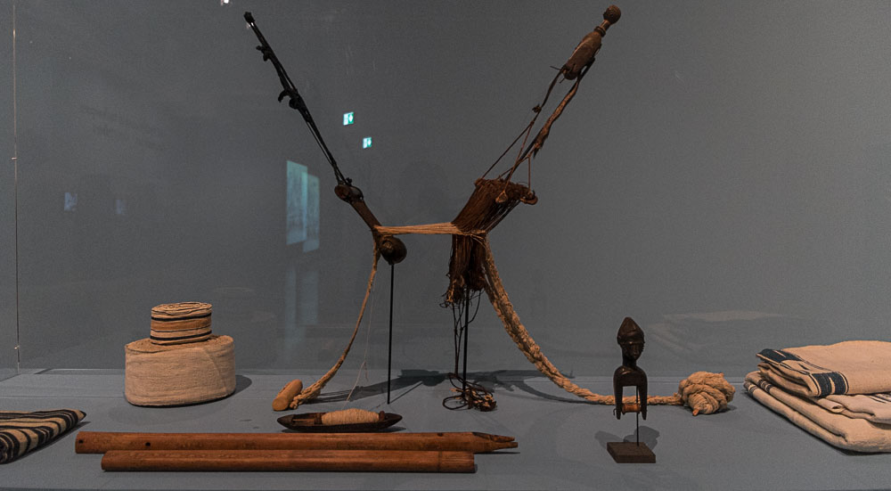 Au milieu de l'exposition, une salle permet de voir, outre le processus de sculpture décrit plus haut, des exemples d'autres techniques pratiquées en Côte d'Ivoire : fonte à la cire perdue version Do-It-Yourself-avec-tes-mains, le placage d'or, le tissage. Ce dernier se pratique sur un métier à tisser à bande étroite, impressionnant par son caractère bricolo-mais-ça-marche, et exclusivement par les hommes. Cette salle tombe un peu comme un cheveu sur la soupe mais n'est pas la moins intéressante du lot.