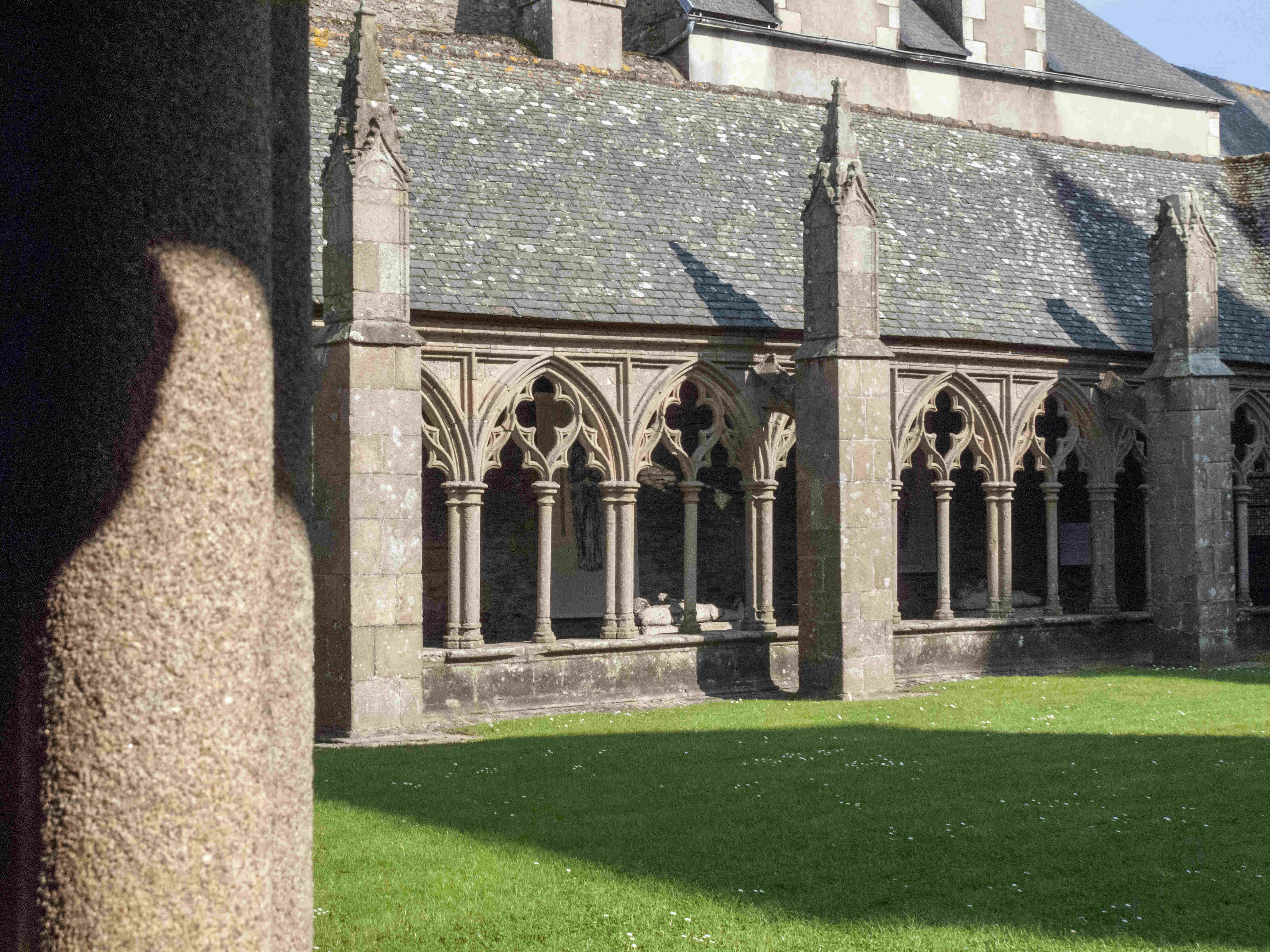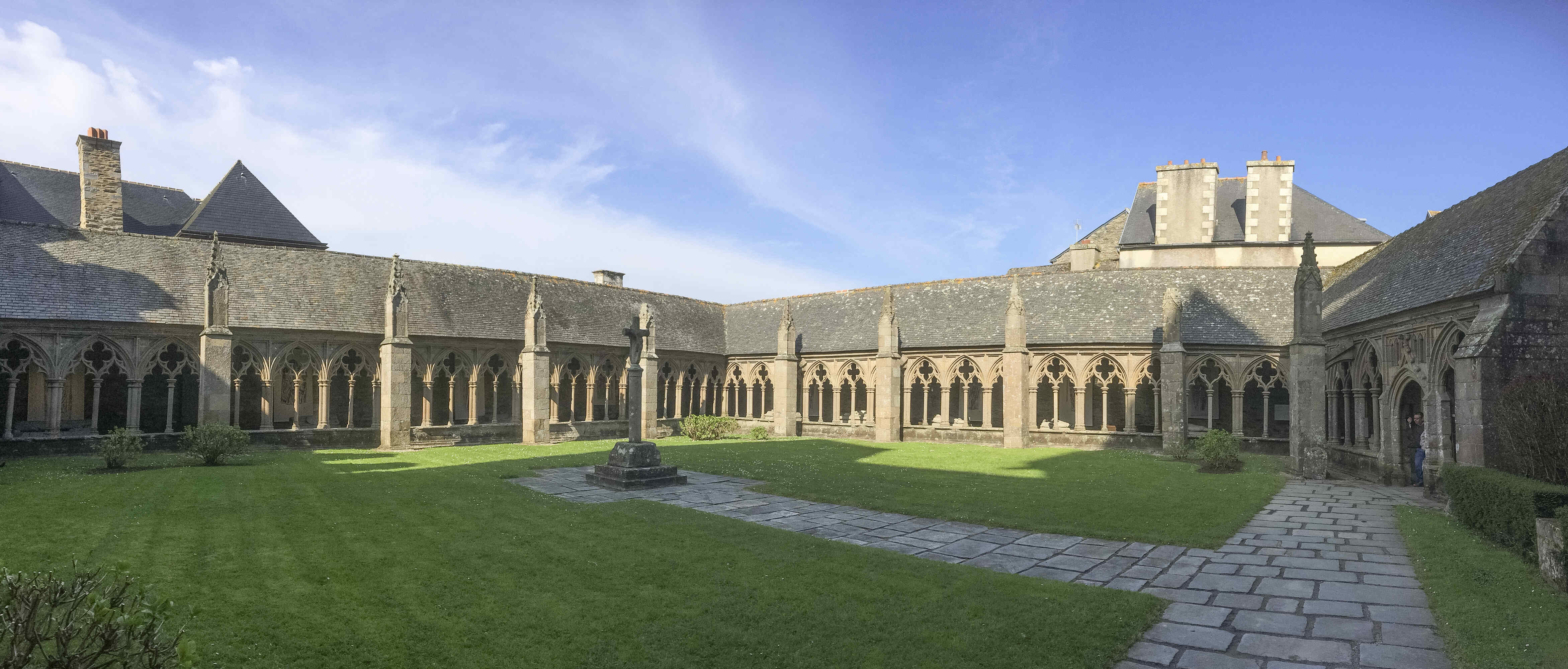 Le cloitre et la cathédrale de Tréguier qui accueille une exposition temporaire d'un artiste paimpolais avec des cénotaphes en sable et matériaux de récupération de l'estran.