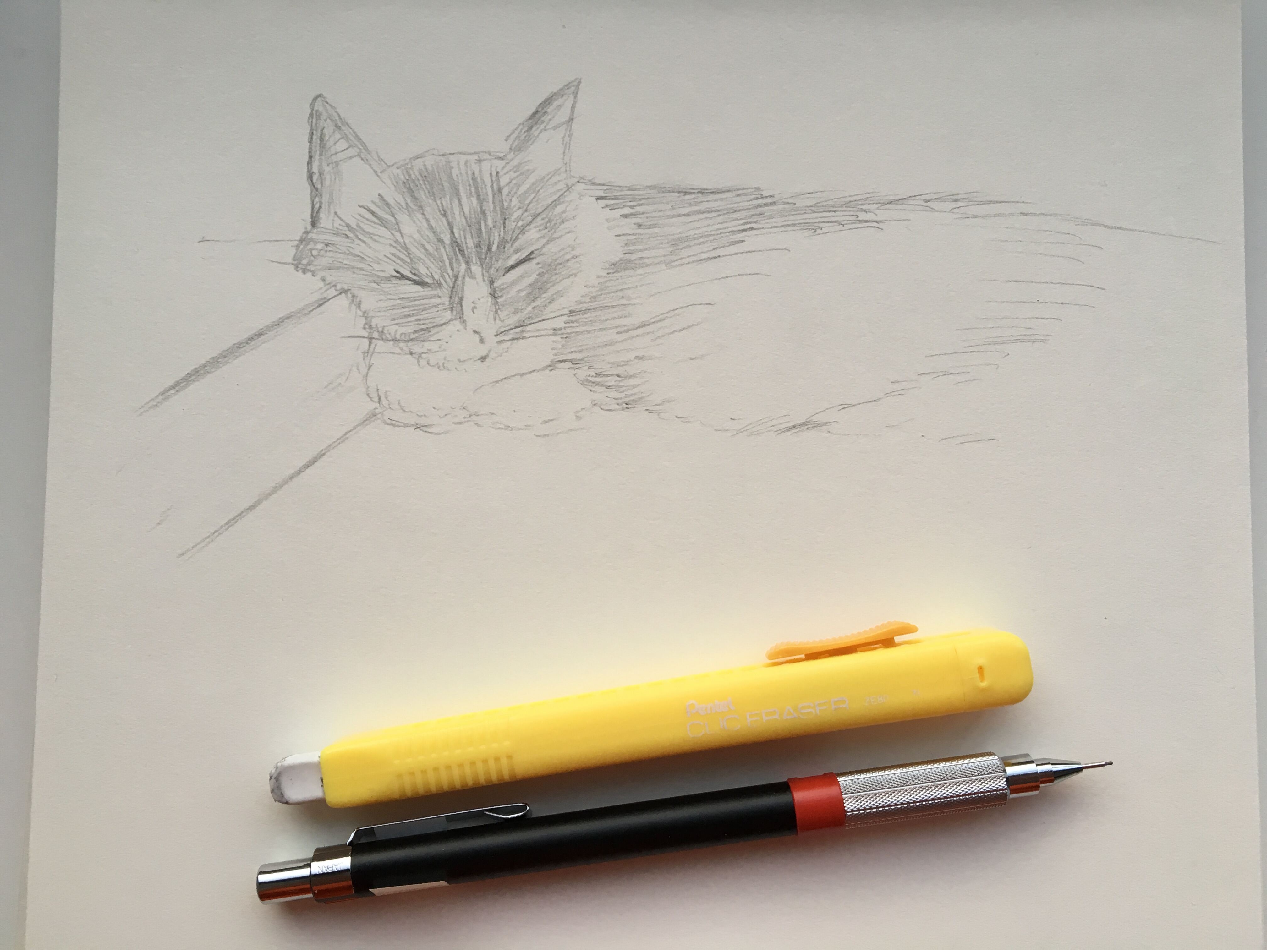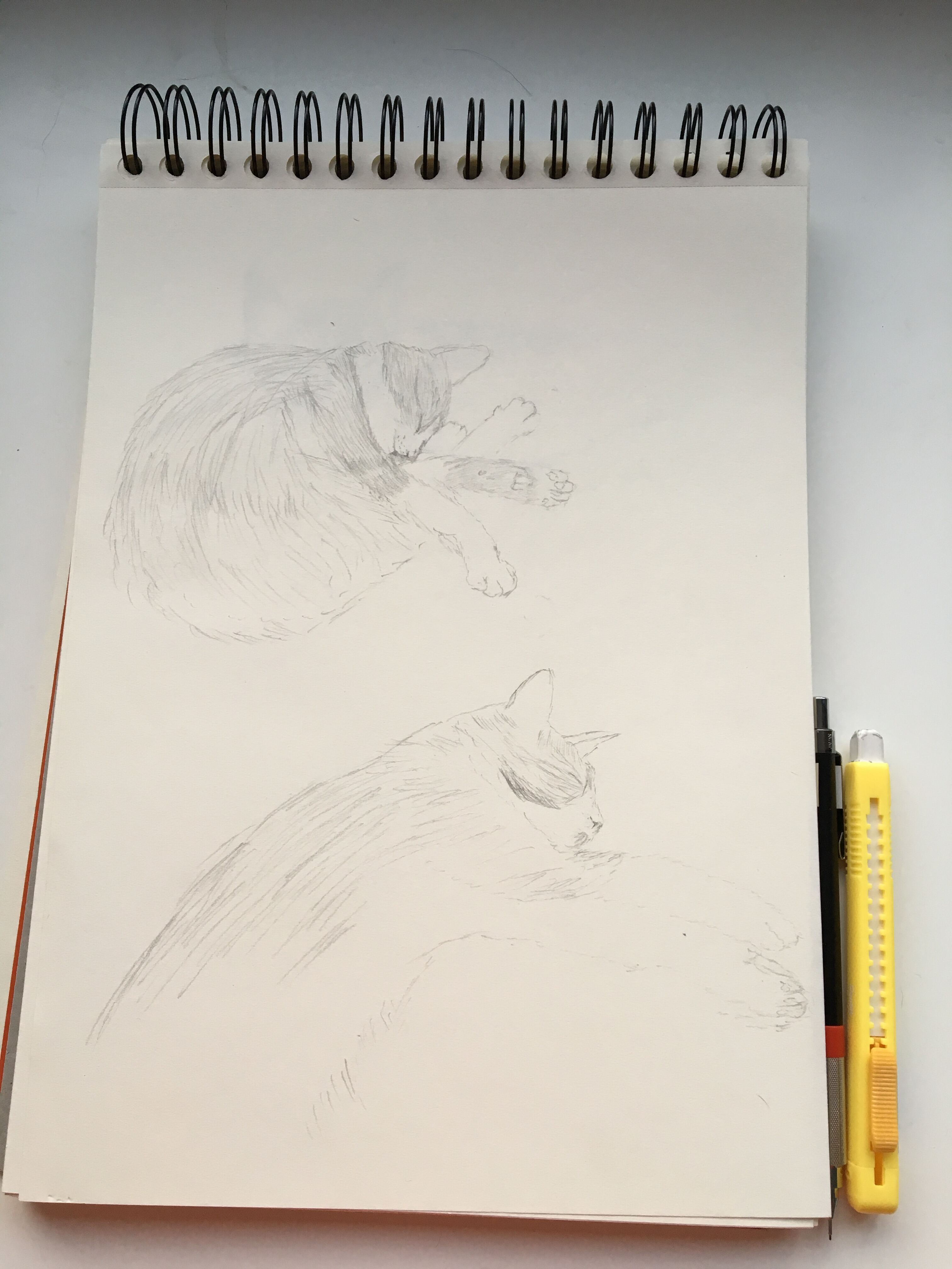 Comme je trouvais que je n'avais pas encore assez de mal à dessiner, j'ai voulu croquer mes chats sur le vif, sans l’intermédiation d'une photo. D'où les postures relativement somnolentes.