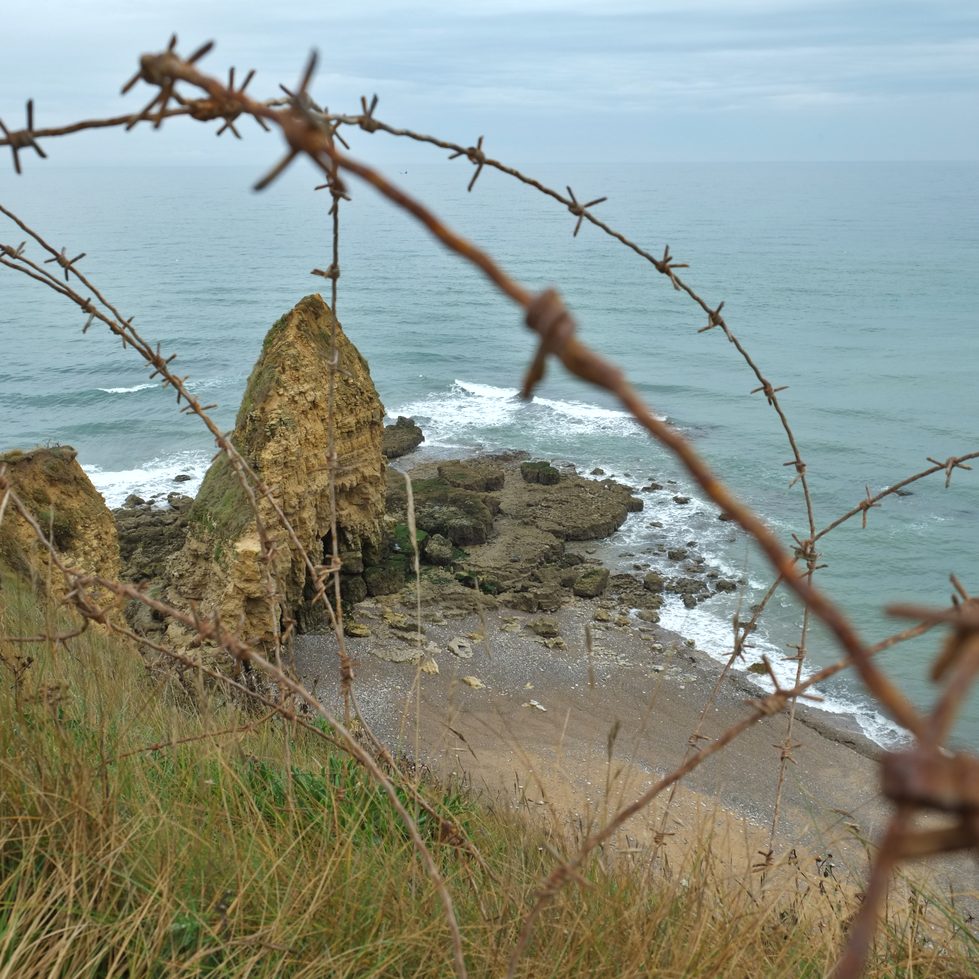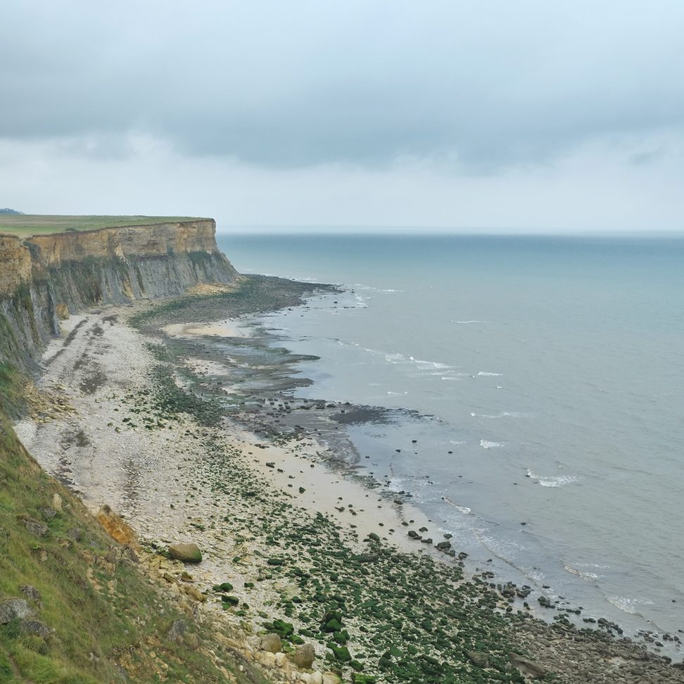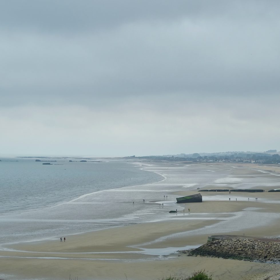 La plage d’Omaha à marée basse est immense, le relief qui attendait les alliés est bien visible avec la pointe du Hoc plus à l’ouest.