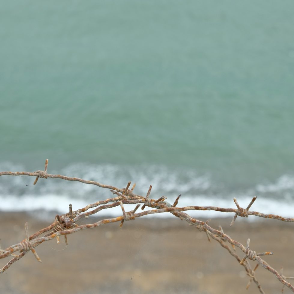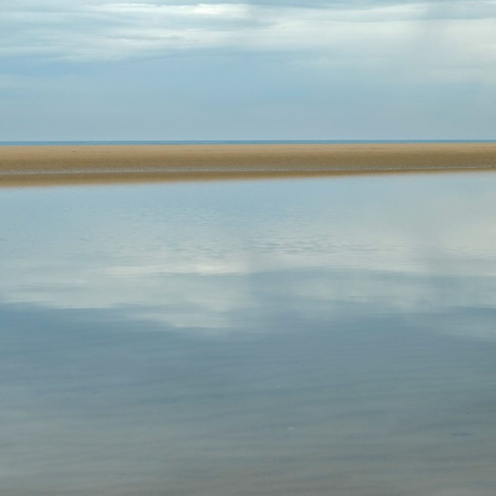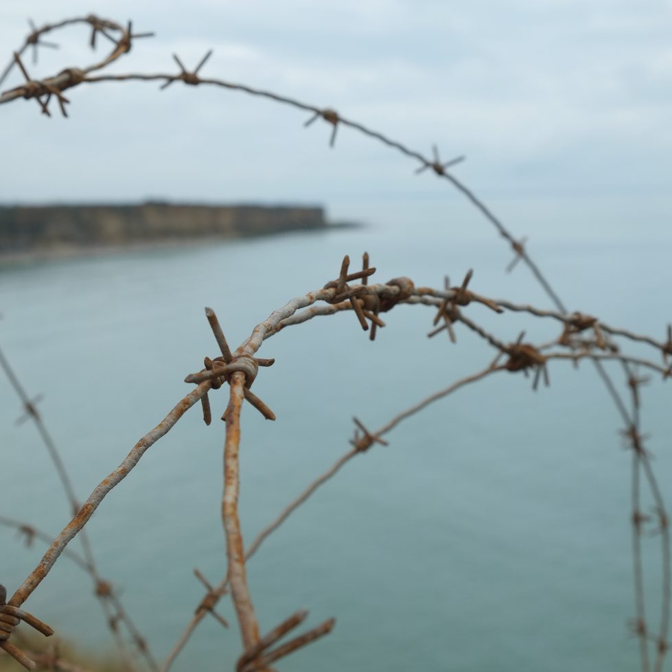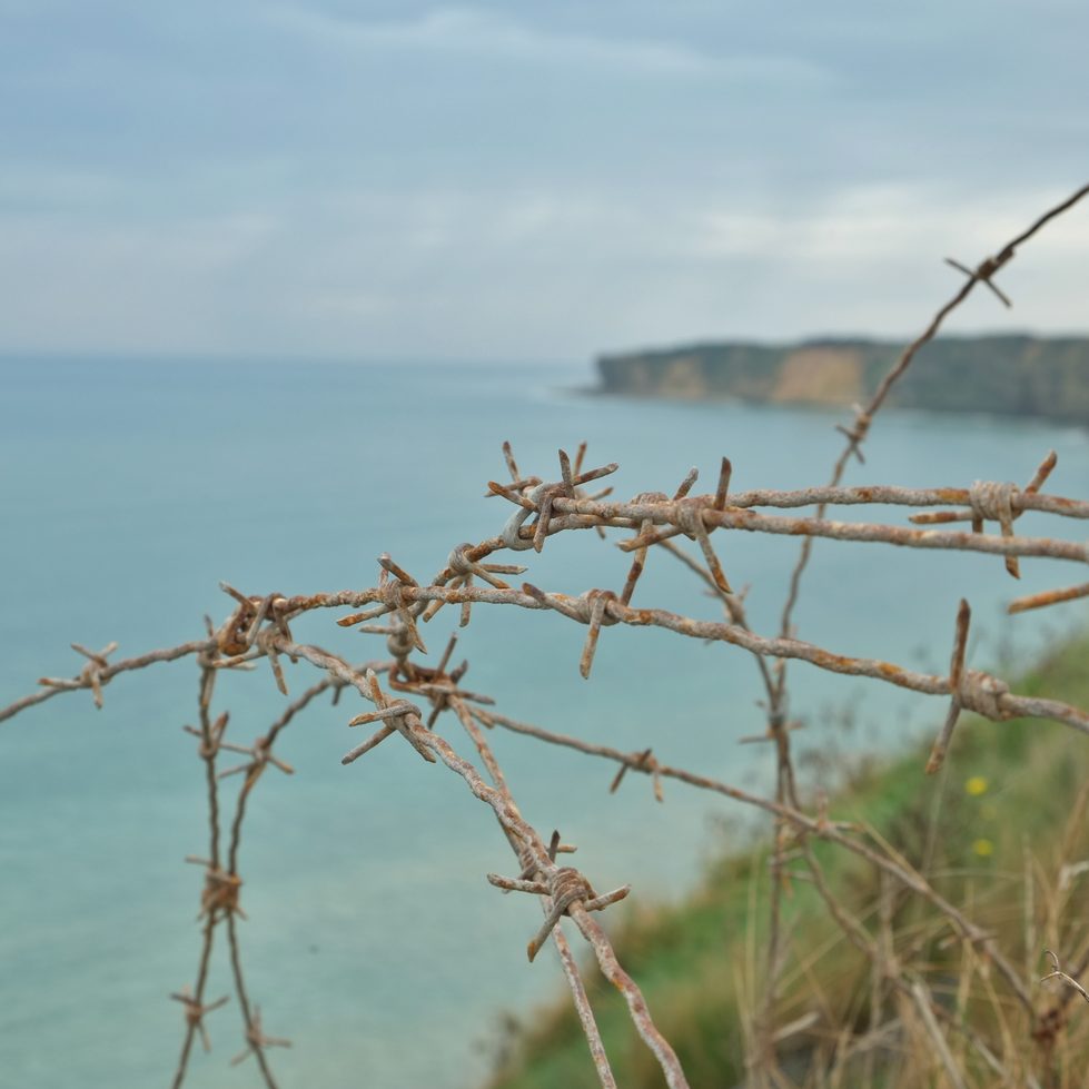 La plage d’Omaha à marée basse est immense, le relief qui attendait les alliés est bien visible avec la pointe du Hoc plus à l’ouest.
