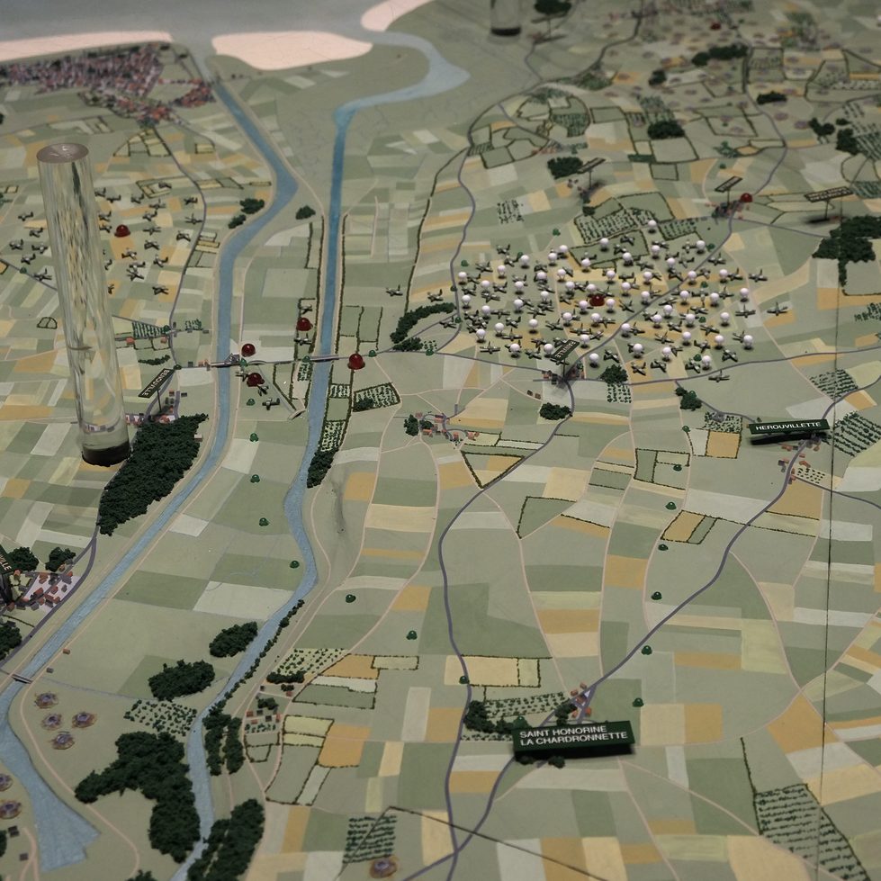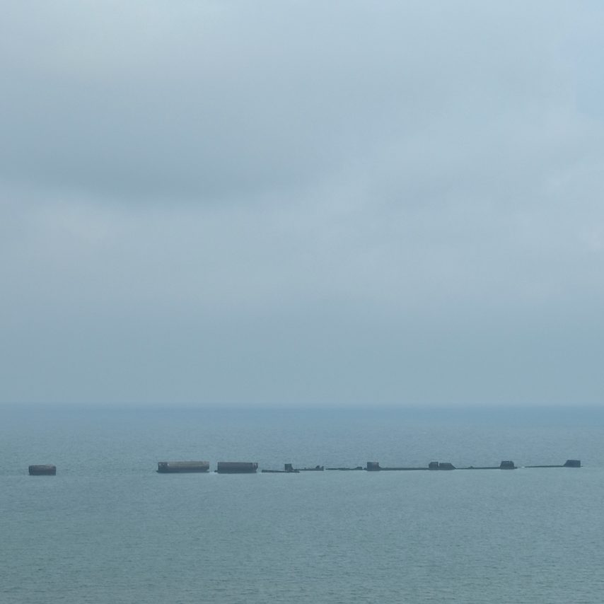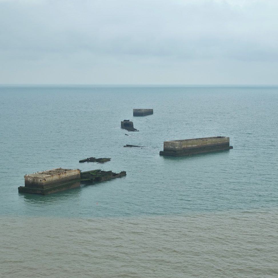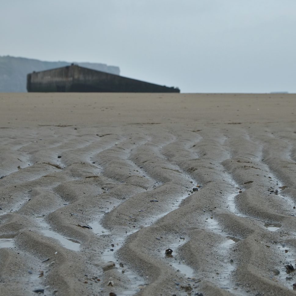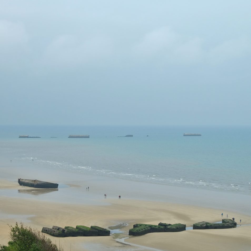 Arromanches est à 20 minutes de route, je fais un premier tour sur la plage à marée descendante, puis visite guidée du musée consacré au port artificiel. Très intéressante maquette montrant le travail de conception des quais, digues et routes flottantes, la tempête de fin juin qui détruisit le port américain et l’abandon des éléments non récupérables – ceux que l’on voit encore aujourd’hui.