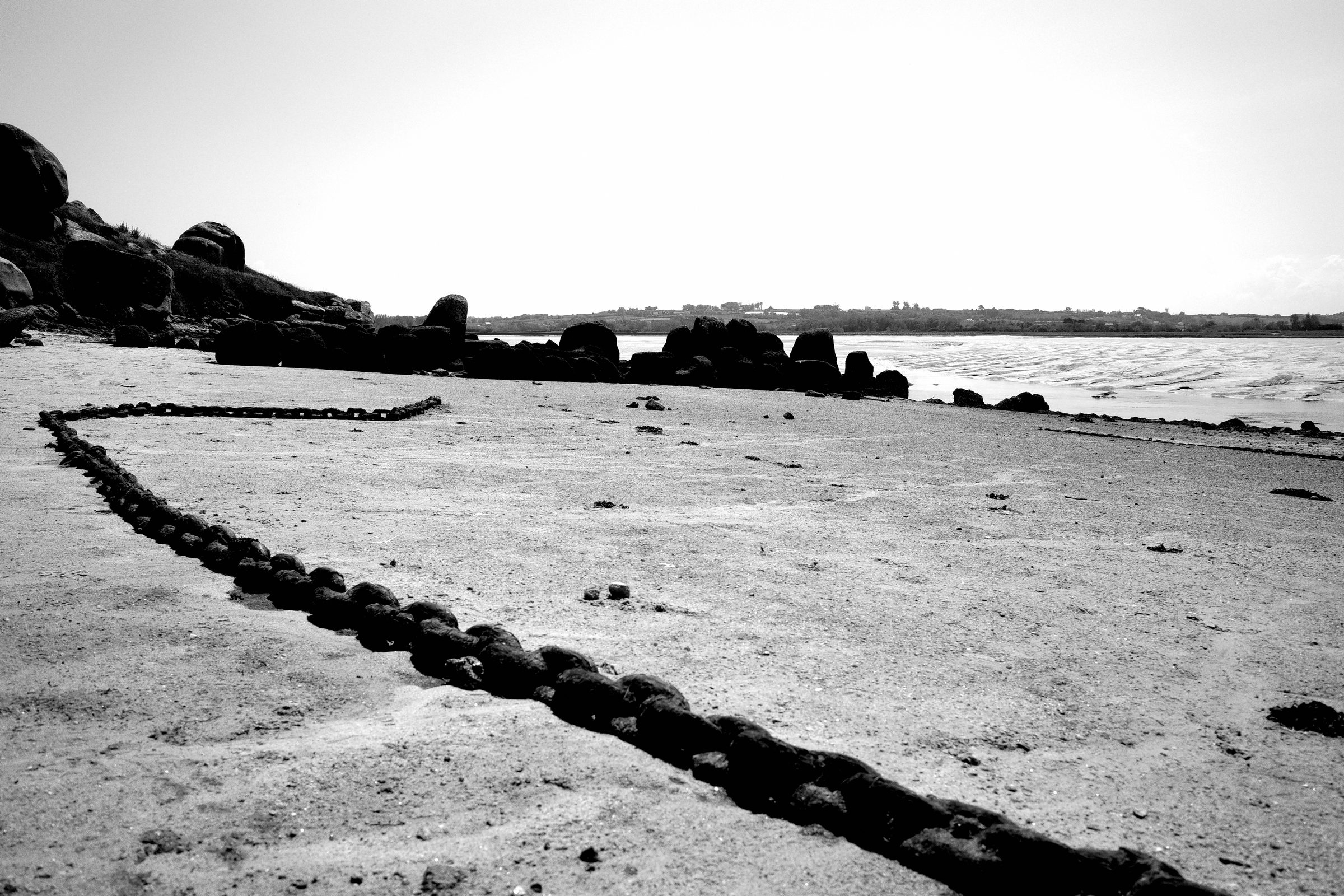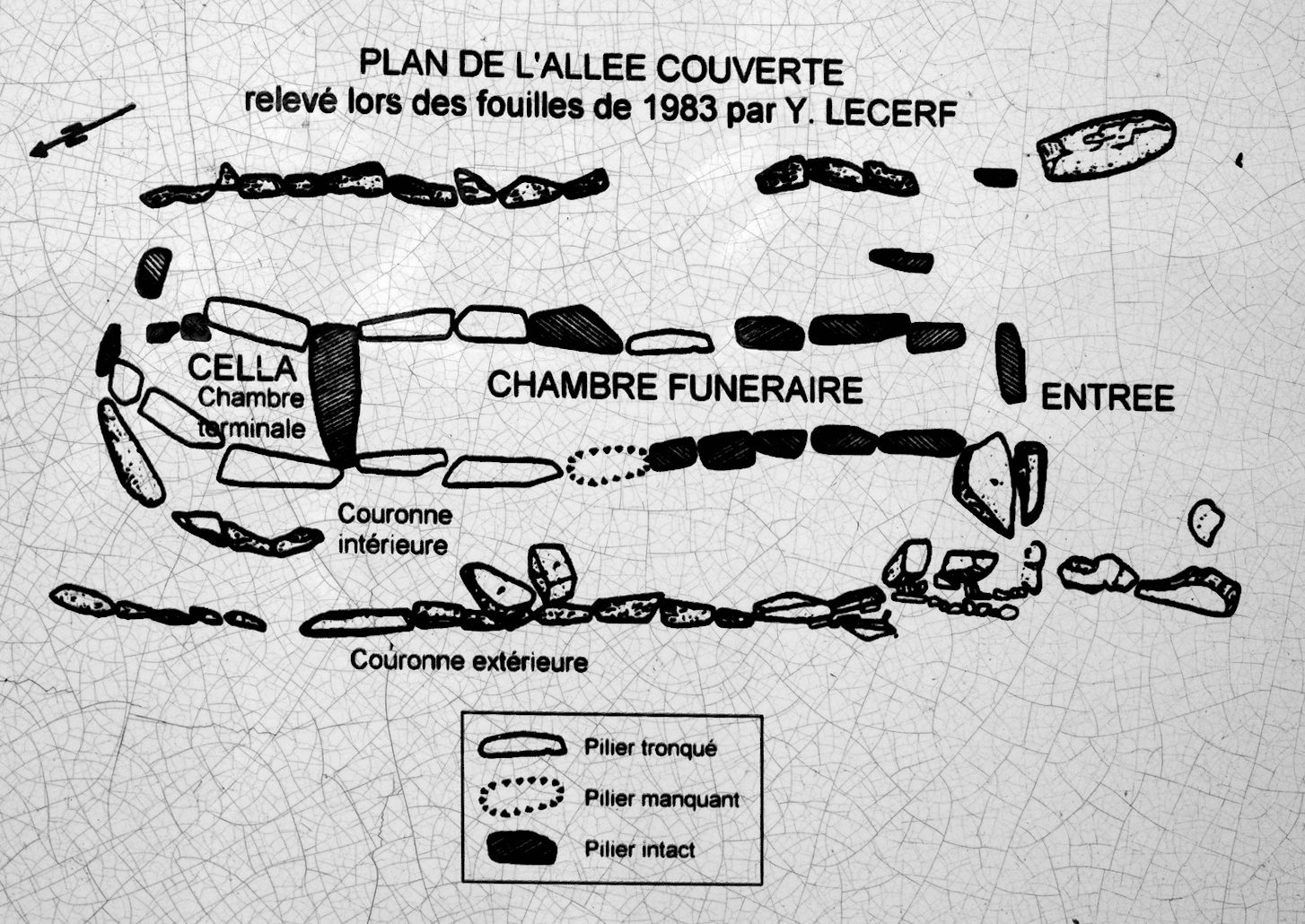 Les pierres couvrantes ne sont plus présentes mais la structure est évidente. Les roches manquantes ont été réemployées pour des cales de goémoniers et des fours à soude (saloupiauds de goémoniers, au four avec leurs algues !) Elle date de -4500 Av JC (fin néolithique, début de l'âge du Bronze). La double enceinte de pierres est une exception dans ce type d'architecture. Le tumulus qui la recouvrait a disparu avec l'avancée de la mer : à l'époque de la construction la mer était 10m en-dessous de son niveau actuel.